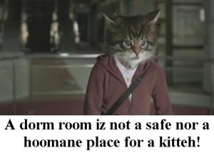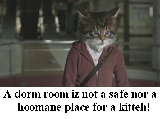 CUDDLES be a kyoot kitteh teh too-old hoomin finds and keeps in her dorm! Because that iz a verrah safe and hoomane place to keep a kitteh! Daniel-San Kitteh sez: