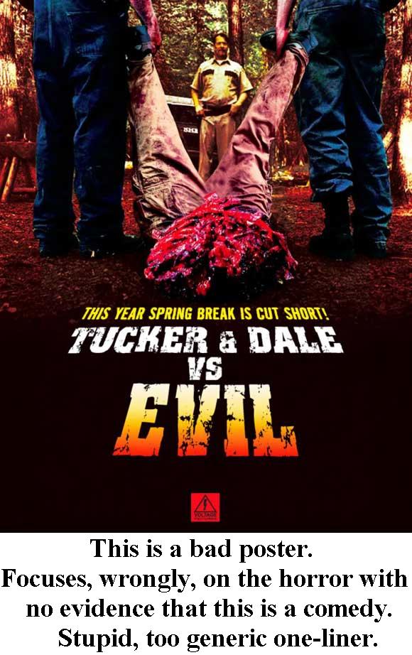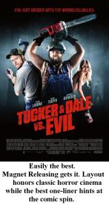 Tucker and Dale raised eyebrows, though, because of that strong Sundance open. Compare it to this summer’s Attack the Block, which had a similar rave-drawing premiere at SXSW in March. Two weeks later, Attack the Block had a distribution deal with Dimension, and four months after it debuted at SXSW, Attack the Block was in theaters. With Tucker and Dale, it seemed more a case of no one quite knowing how to sell it. It’s a gory slasher flick, but it’s also hilarious comedy. (Word to the marketers—you sell it with a straight face. This isn’t really that hard, but this movie had 5 posters in North America alone. And not like, fun character posters but five “we don’t know what our product is” posters. I’ve rated them all to the left.) There’s no “name” star and it’s a no-name first-time director, Eli Craig, whose major accomplishment is being the son of Sally Field. What are we selling? Who do we sell? (Hint: Horror comedy and the hillbillies, you morons.) So it languished until Magnet Releasing, who also brought us Hobo with a Shotgun and Rubber, got a hold of it. Even then, marketing has been pretty skint for this movie.