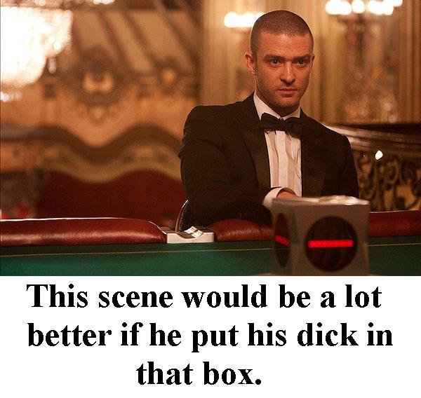 The least useful villain was Alex Pettyfer’s “Fortis”. I think he was some kind of gang leader? I never really knew. At any rate, he wore a gangstery suit and went around mugging people of time. He had the worst dialogue in the movie, bar none. His character was hugely useless, serving only to set up a scene in which the hero, Will (Justin Timberlake), kills a bunch of people stylishly. Yet Pettyfer chomps through that shit like it’s the acting Olympics. This is the third time I’ve seen him in a movie this year and it’s the first time he’s really been engaged with his material. He is having a blast waving his gun around and being menacing. Pettyfer is so pretty they’re going to try and make him a leading man but he’s born to play villains.