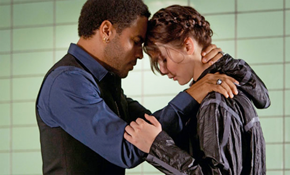 young’un Willow Shields as Katniss’s sister, Prim. Though we only get a handful of moments between Katniss and Prim, Shields and Lawrence establish their relationship well enough that it means something when Katniss says she’s trying to win for Prim. Liam Hemsworth looks effectively broody and rugged as Katniss’s best friend Gale, though he has little to accomplish here except establish that he like-likes Katniss. And the adults are beautifully cast across the board. Woody Harrelson delivers a savvier take on the drunk Haymitch, who is supposed to mentor Katniss and Peeta through the Games. I really liked the adjustment to Haymitch’s character, and getting to see him working the room on behalf of his tributes during the Games. Elizabeth Banks was delightful as the officious Effie Trinket—the expression on her face as she walked through District 12, as if she smelled something bad, cracked me up. And Lenny Kravitz is The Sex as Katniss’s stylist, Cinna. Oh, and Stanley Tucci! He was smarmily perfect as television host Caesar Flickerman.