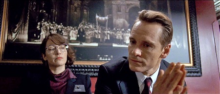 Steve Jobs follows a three-act structure so clearly defined that this film could easily be translated to a stage performance. The smallness of space in the film adds to the stagey-ness of the story, as most of the film takes place in hallways and square rooms. This is not the most visually engaging film and director Danny Boyle works hard to overcome the physical limits of Sorkin’s script. He project images on walls behind characters, he uses tracking shots to keep the camera moving between characters during dialogue exchanges, and finally, he gives up and cuts to interstitial scenes happening in separate locations altogether. There are only so many times you can film in a hallway before we’re sick of looking at hallways.